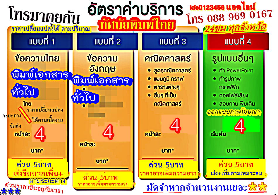 ร้านพิมพ์งาน ต่างๆ ปรึกษาได้ ภาษาไทย อังกฤษ หลายราคา สอบถามเข้ามาได้ บริการถึงที่ และ EMS ทีมงานรับพิมพ์งาน แปลภาษา ต่างๆ -จัดข้อมูลวางรูปแบบให้สวยงาม และทางการ